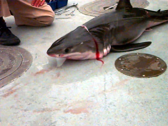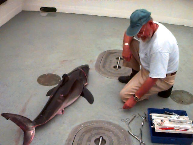 Today Glenn got a call from someone who had caught a Great White. Since we are interested in the brains of these critters, Glenn was contacted. We were able to get the fish and game permits to collect material from the animal. It was very young, smaller than the one Glenn and I had collected the brain from 3 years ago, but it was none the less a great white.